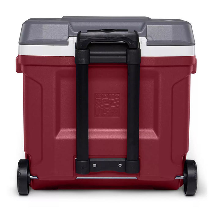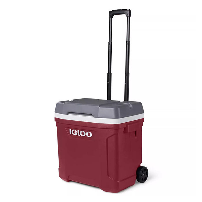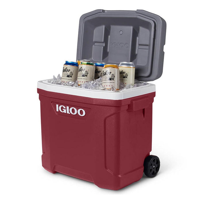 Hielera con ruedas Igloo Latitude 30 QT Roja Índigo I-H30LTRR. Ideal para viajes cortos o comidas al aire libre, con capacidad de hasta 43 latas (28 litros). Gracias a su diseño alto, permite colocar botellas de vino o botellas de 2 litros en posición vertical. Cuenta con aislamiento térmico Thermecool™ y tecnología Cool Riser® para mejorar el rendimiento de enfriamiento. Incluye tapa con portavasos, ruedas incorporadas, asa telescópica y asas laterales moldeadas.